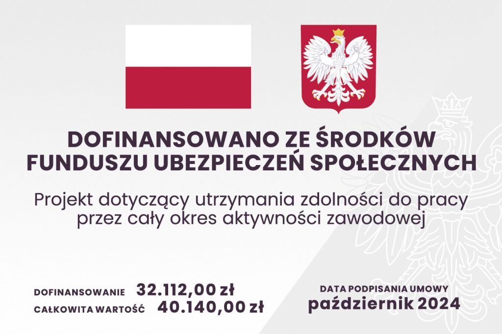 Inwestycja dofinansowana jest ze środków Funduszu Ubezpieczeń Społecznych w ramach zadania: „Projekt dotyczący utrzymania zdolności do pracy przez cały okres aktywności zawodowej”.